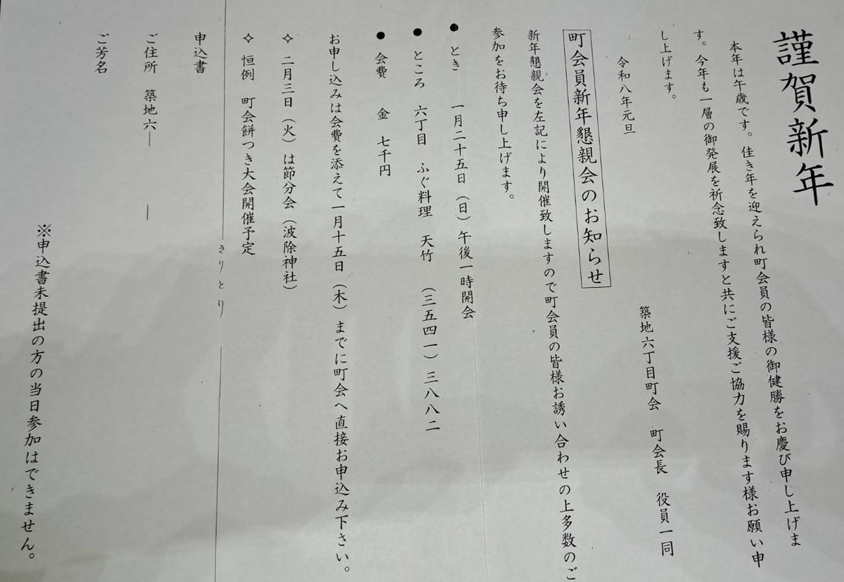 お知らせ 2026.01.07 お知らせ 新年会 / 築地六丁目 令和8年 町会員新年懇親会のお知らせ 謹賀新年 新年懇親会を下記により開催致します。ご近所、町会員のお友達をお誘いいただき多数の御参加をお待ち申し上げます。 日時:1月25日(日)13時開会 場所:六丁目ふぐ料理 天竹 電話:天竹(3541)3882 会費:金7,000円 お申込みは会費を添えて、1月15日(木)迄に町会事務所へ直接お申込み下さい。規定数になり次第、〆切とさせていただきます。 天竹さんの場所はこちらになります。 こちらでもご覧になれます。 宜しくお願い致します。 SmaSurf クイック検索 前へ 次へ